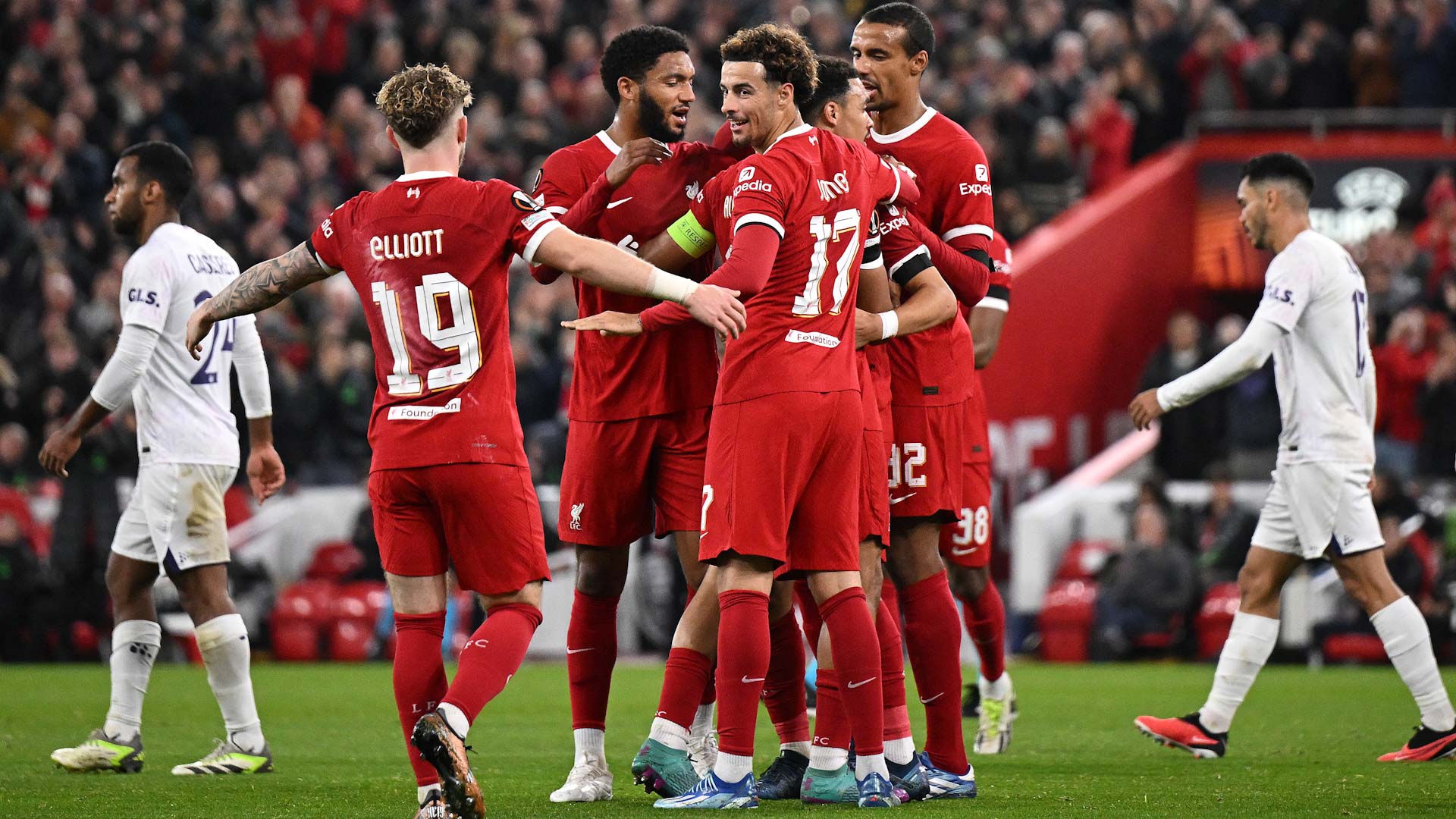 وعلى ملعب (آنفيلد)، تقدم ليفربول مبكرا بواسطة البرتغالي ديوجو جوتا، قبل أن يتعادل تولوز سريعاً في الدقيقة 16 من خلال تيس دالينجا.