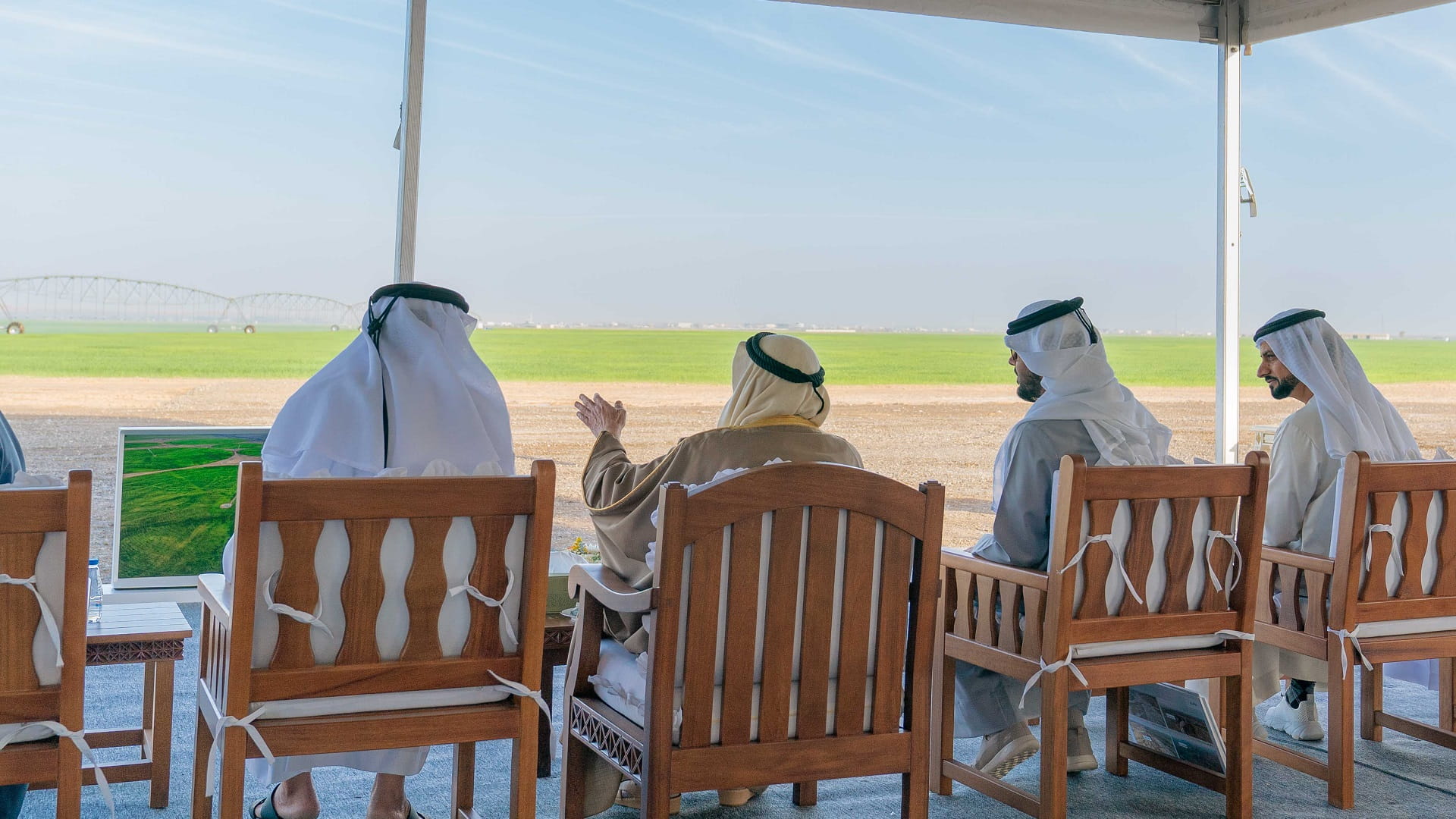 وتابع سموه، فور وصوله، أعمال الزراعة وري محاور القمح باستخدام أحدث وأفضل المعدات المتقدمة التي تعمل وفق التقنيات الحديثة الموفرة للمياه، والتي تساعد أيضاً في مراقبة الأداء ومتابعة احتياج التربة والنبات وتحقيق التوازن بينهما، واستخدام المجسات الأرضية ومحطة أرصاد جوية تساعد في قياس الرطوبة، وذلك للحصول على أفضل المحاصيل من القمح.