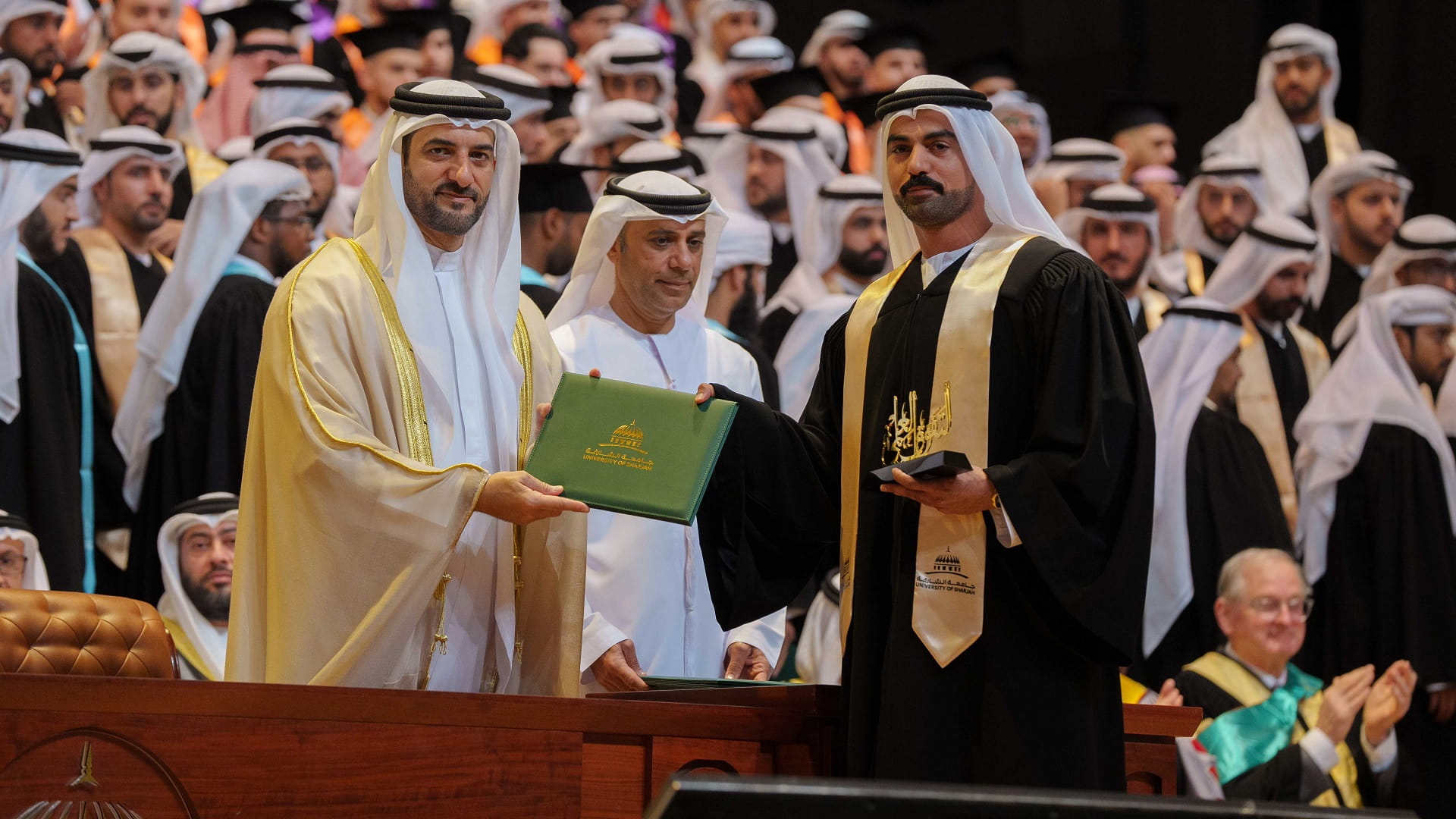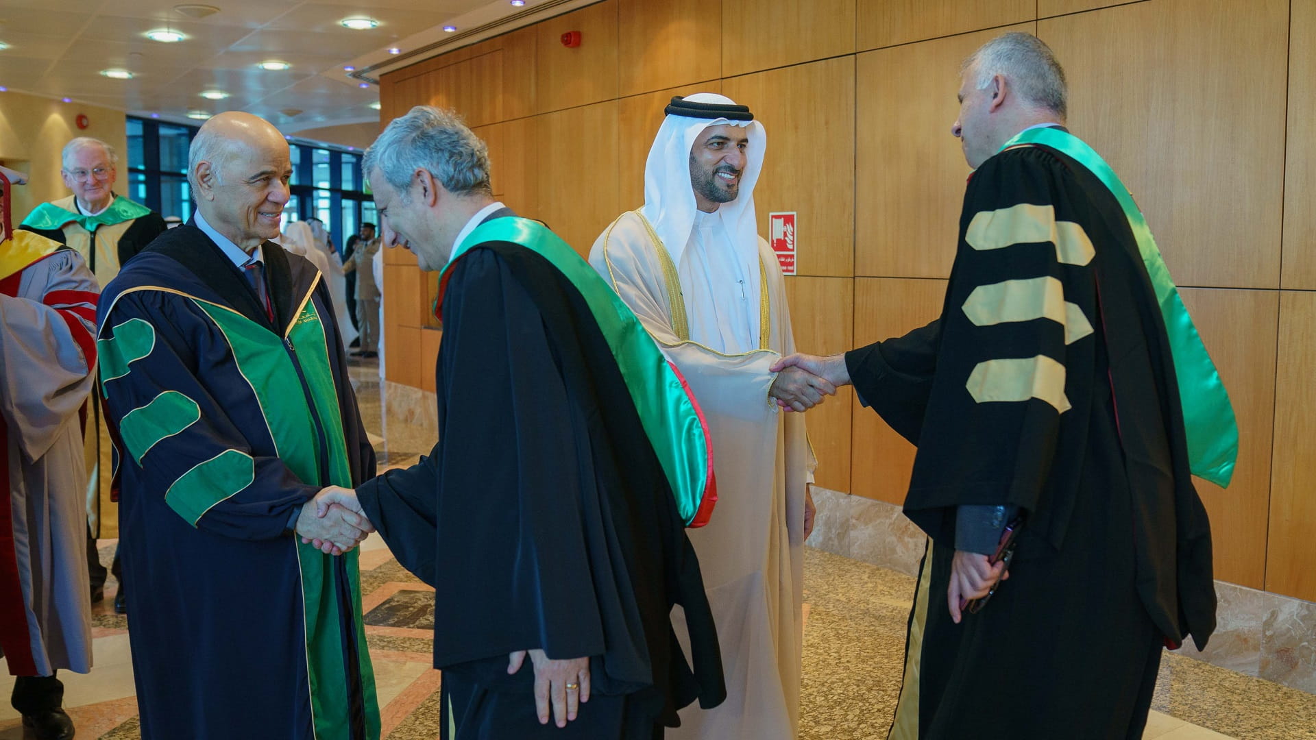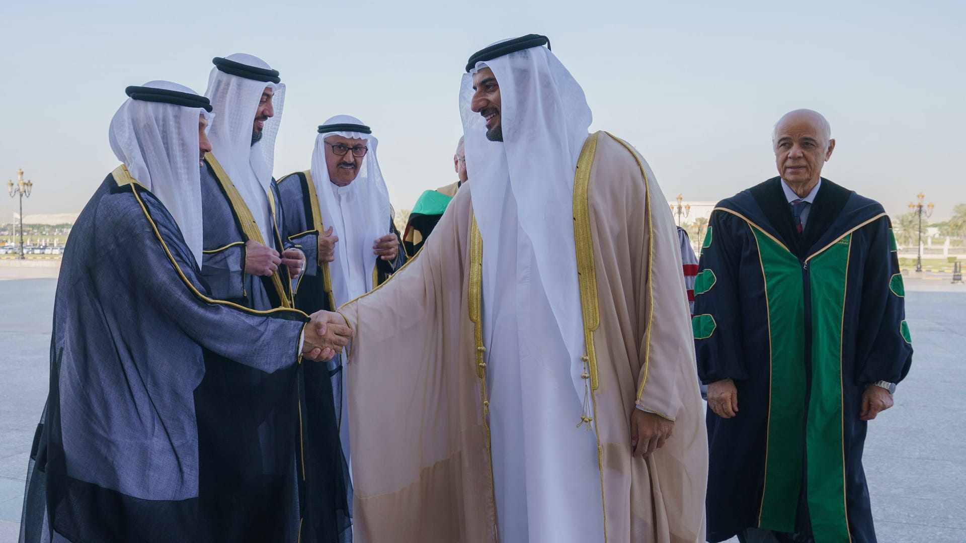 وعقب حفل التخريج، صافح سمو رئيس جامعة الشارقة، نواب مدير جامعة الشارقة وعمداء الكليات وأعضاء الهيئة التدريسية، شاكراً لهم جهودهم.