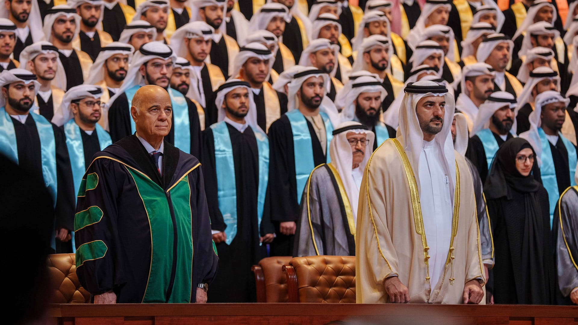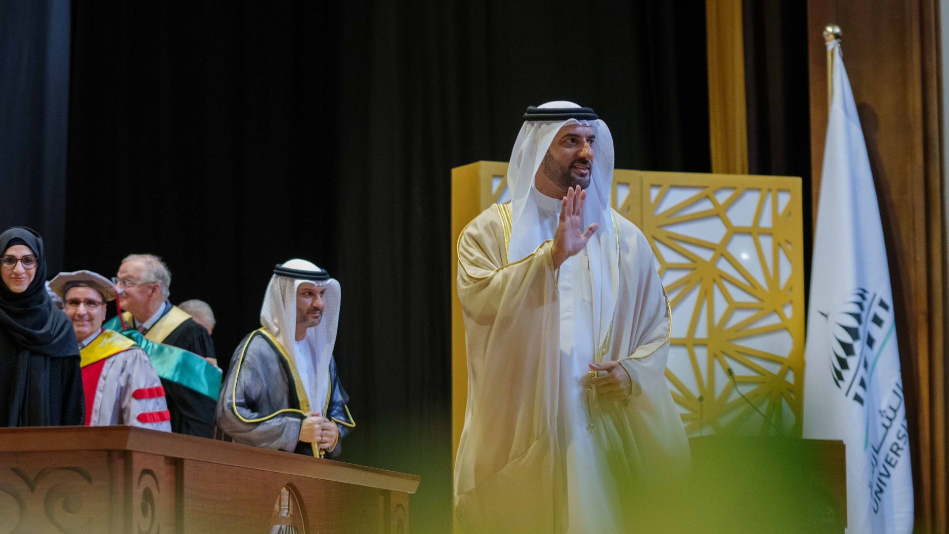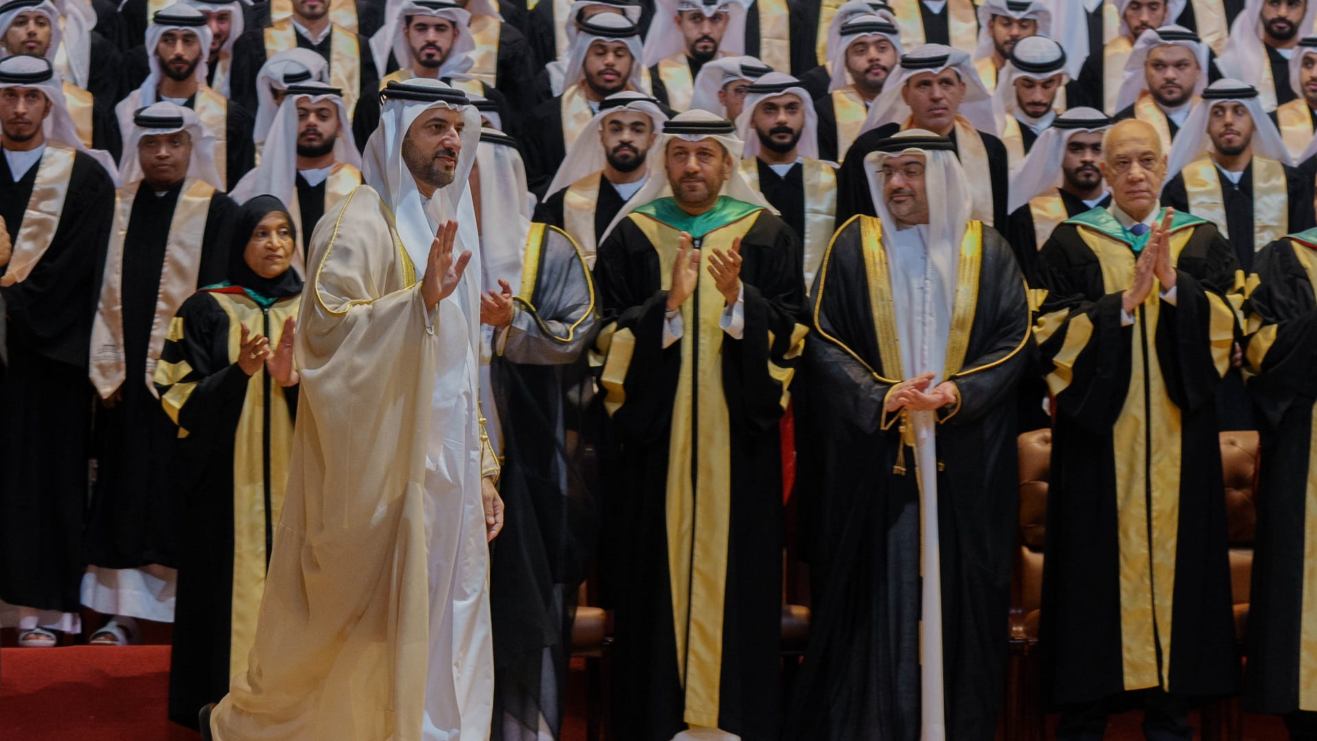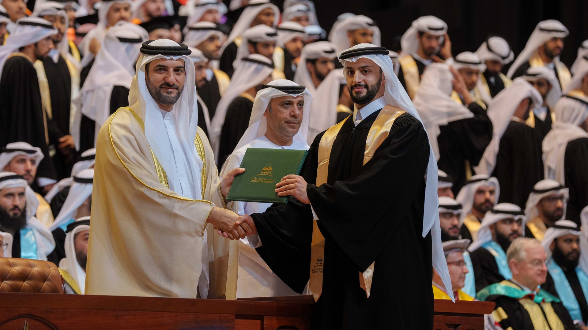 وعقب حفل التخريج، صافح سمو رئيس جامعة الشارقة، نواب مدير جامعة الشارقة وعمداء الكليات وأعضاء الهيئة التدريسية، شاكراً لهم جهودهم.