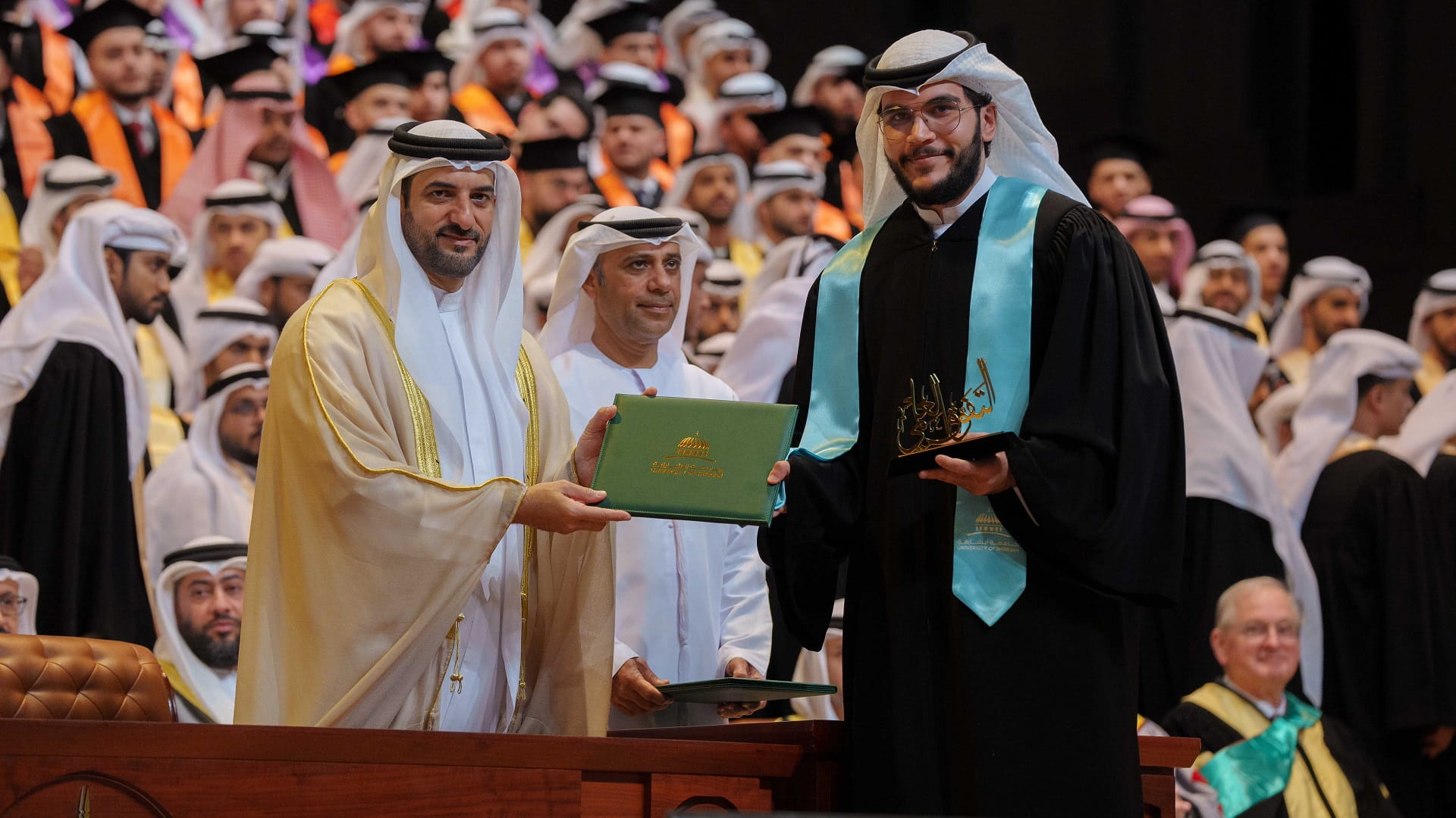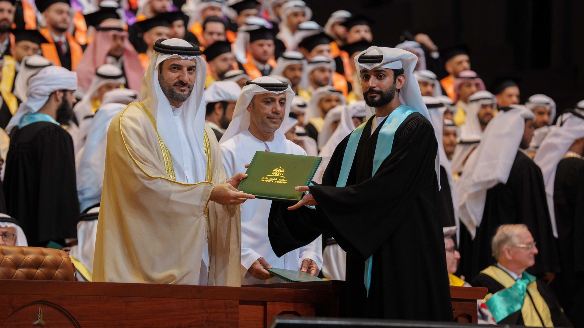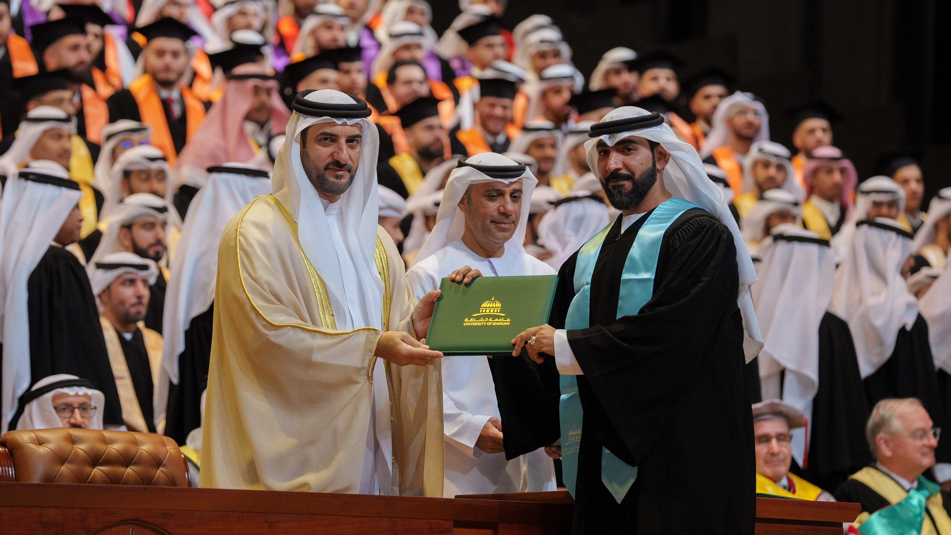 وتفضل سمو رئيس جامعة الشارقة، بتسليم الشهادات للطلاب الخريجين البالغ عددهم 574 خريجاً من مختلف برامج البكالوريوس، مهنئاً سموه تخرجهم، وراجياً لهم التوفيق والسداد في حياتهم القادمة.