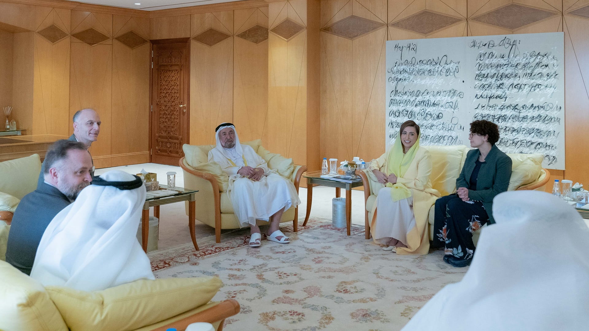 وتسلم صاحب السمو حاكم الشارقة هدية تذكارية من المعهد، ملتقطاً سموه صورة جماعية مع الوفد الكندي.