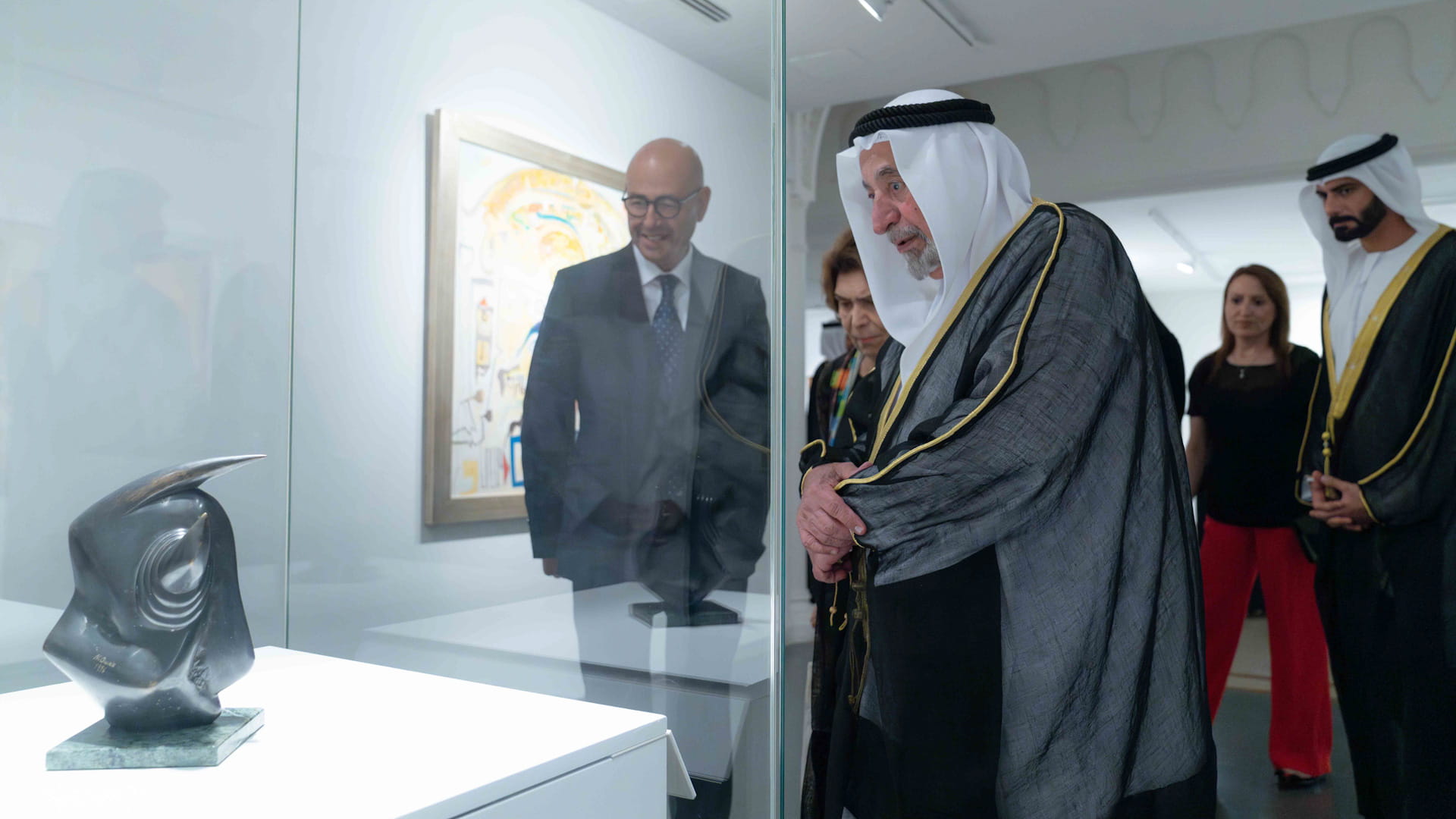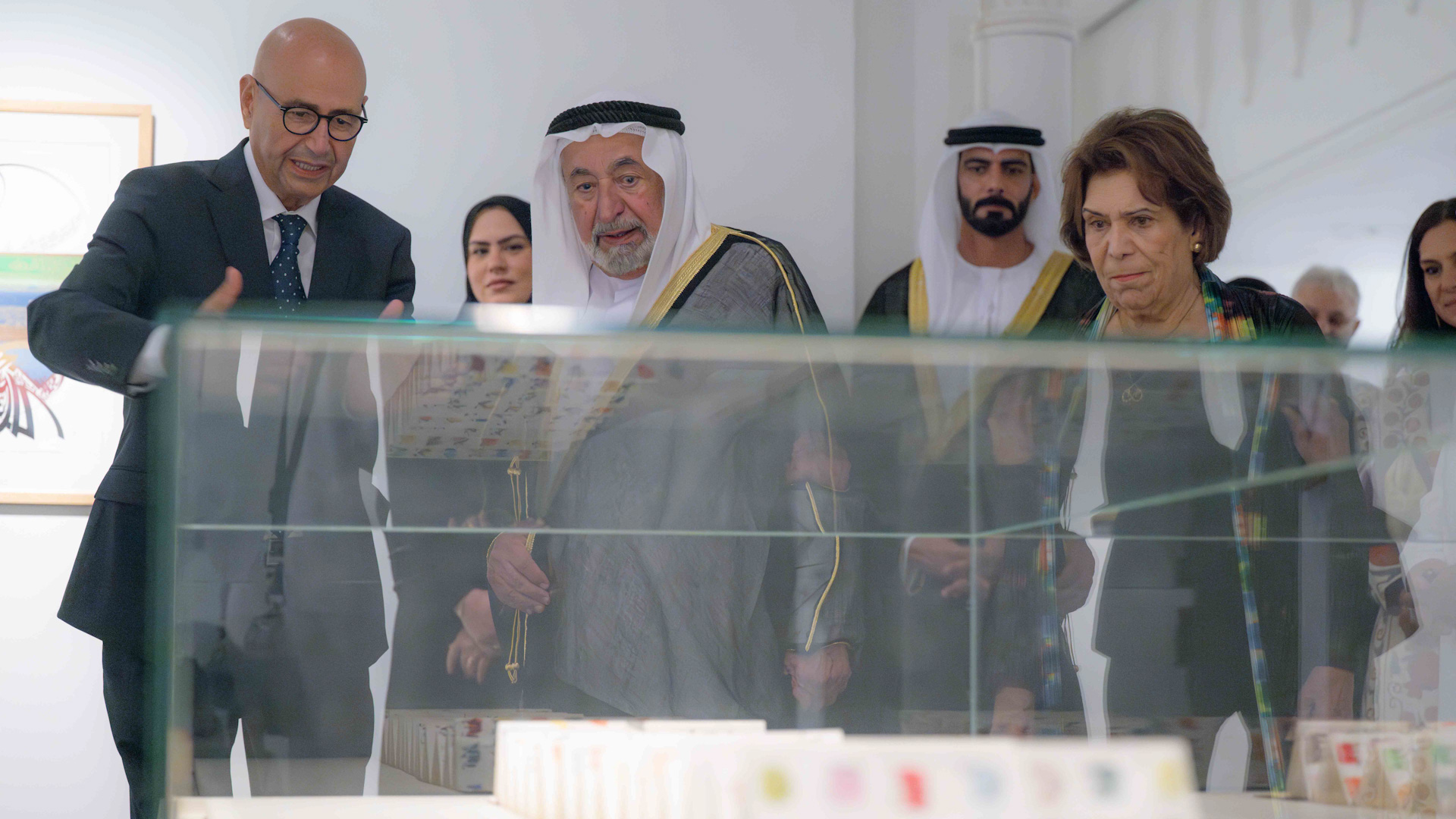 وشاهد صاحب السمو حاكم الشارقة، خلال جولته، المعروضات والأعمال المتنوعة والتي استُخدم فيها الألوان المائية والنقوش الدقيقة والمنحوتات البرونزية المعبرة، بالإضافة إلى أبرز الأيقونات الفنية مثل "الوليمة في الصحراء"، و"فلسطين الأم"، حيث يقدم كل عمل رؤى عميقة في السرديات الثقافية والاجتماعية والسياسية التي شكلت المنطقة.