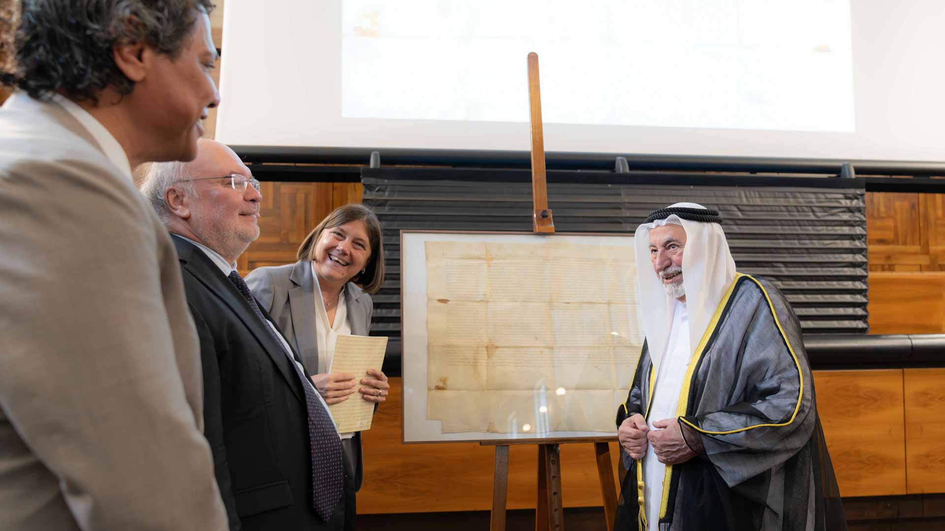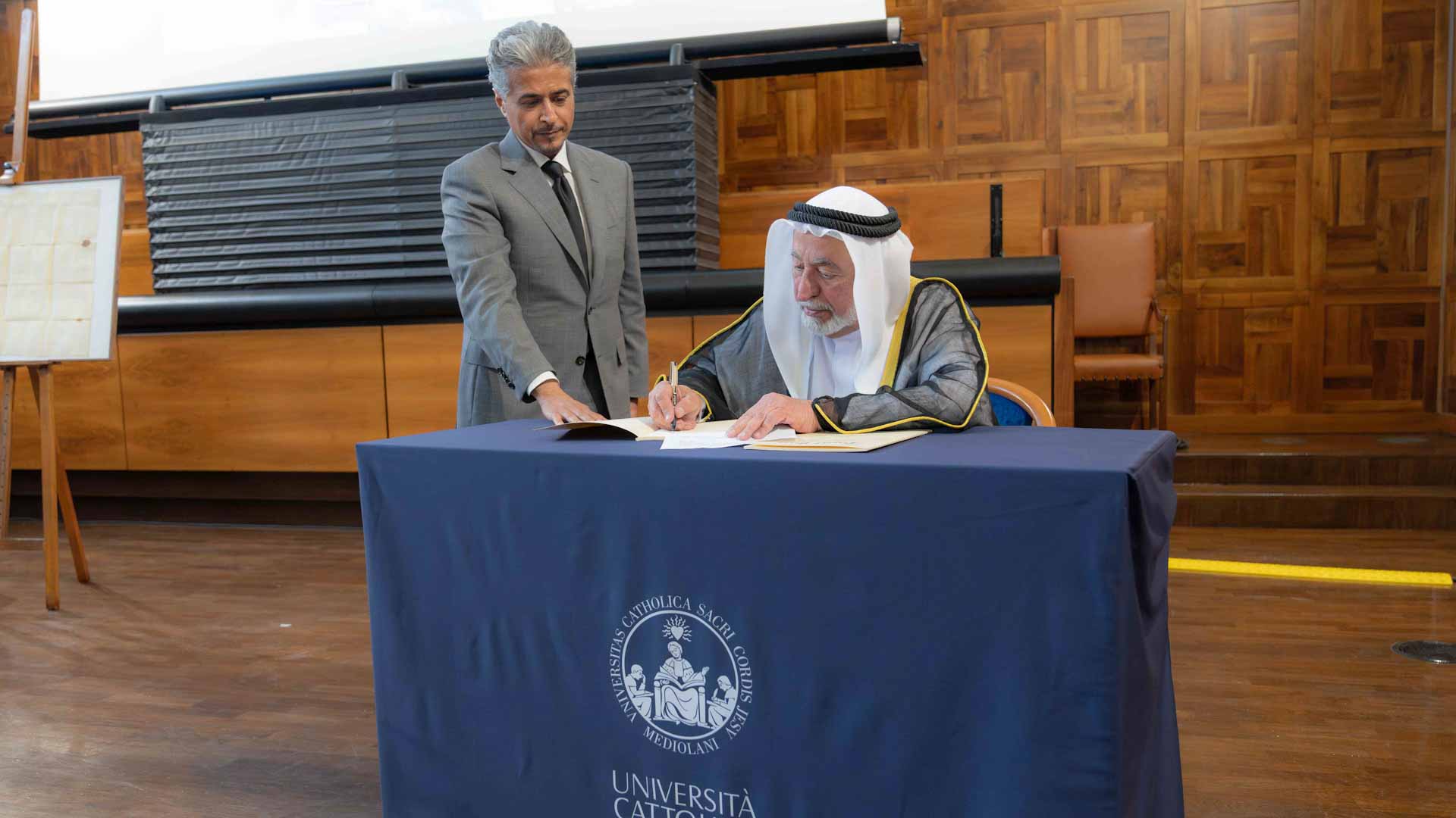 أهدى صاحب السمو الشيخ الدكتور سلطان بن محمد القاسمي عضو المجلس الأعلى حاكم الشارقة، بحضور قرينته سمو الشيخة جواهر بنت محمد القاسمي رئيسة المجلس الأعلى لشؤون الأسرة، مخطوطاً تاريخياً أصلياً ونادراً إلى جامعة القلب المقدس الكاثوليكية في مدينة ميلانو الإيطالية، ويعود تاريخ المخطوط إلى 14 من أغسطس عام 1624م، ويتضمن مرسوماً بابوياً حرره البابا أوربان الثامن وختمه في كنيسة "سانتا ماريا مجوري" في العاصمة روما، إضافةً إلى كتاب سموه "مرسوم بابوي" باللغتين العربية والإنجليزية، وذلك في مقر الجامعة.