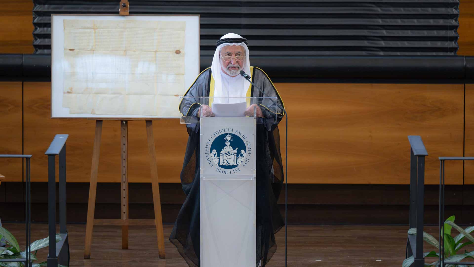 واختتم سموه كلمته مخاطباً الحضور، قائلاً: "السيدات والسادة، إنني في هذا اليوم، أقدم هذا المخطوط، إهداءً إلى جامعة القلب المقدس الكاثوليكية، وكذلك كتاب مرسوم بابوي، وهو تحقيق لذلك المخطوط، ليوضع في مكانه الصحيح، في هذه الجامعة العريقة، عرفاناً مني بهذا التعاون الأكاديمي لهذه الجامعة".