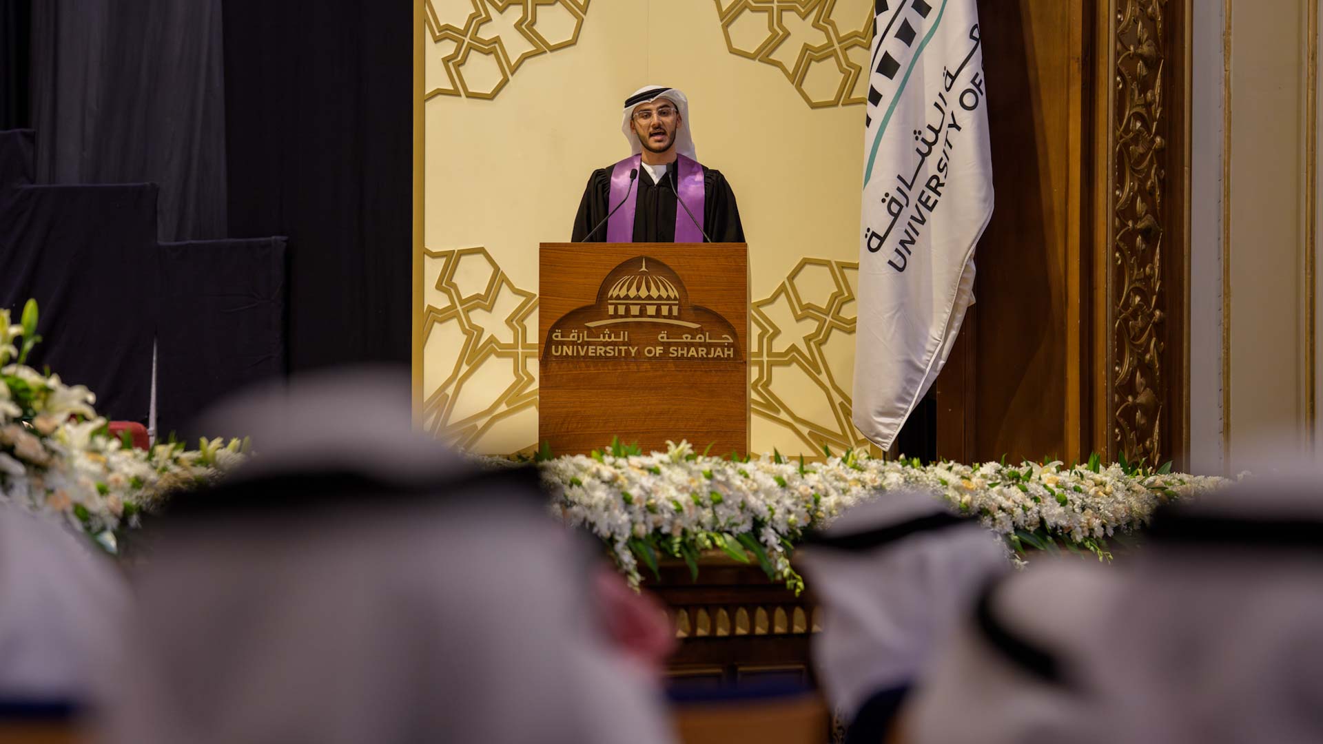 من جانبه ألقى الخريج صالح محمد الجسمي من كلية القانون، كلمة الخريجين الذي أعرب خلالها عن فخر الخريجين واعتزازهم بالوقوف أمام الحضور، مثمناً جهود صاحب السمو حاكم الشارقة في تأسيس الجامعة ونظرته الثاقبة التي قادت الجامعة إلى النجاحات، قائلاً: "أنتم يا صاحب السمو حاكم الشارقة، مثال استثنائي، لحاكم، وهب فكره وقلبه ووقته لبناء حضارة، أساسها العلم والثقافة والعدل".