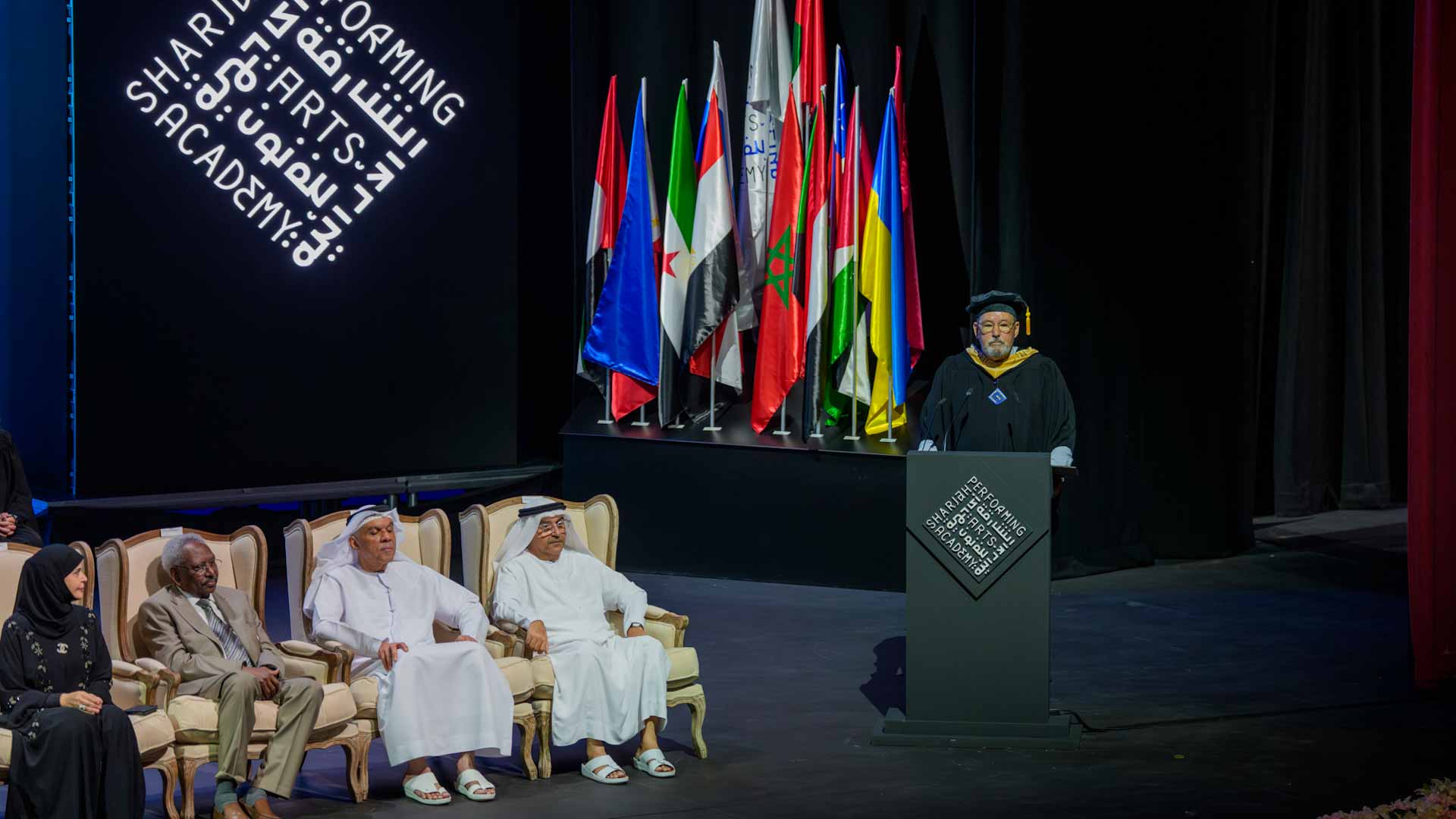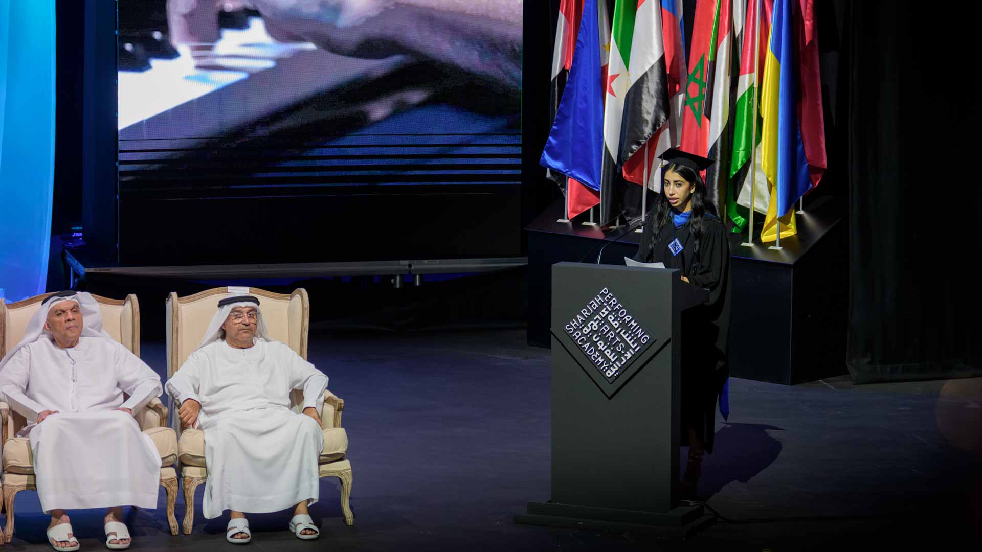 وتحدث المدير التنفيذي لأكاديمية الشارقة للفنون الأدائية للخريجين مستذكراً السنوات التي قضوها في الأكاديمية قائلاً: "لقد تطورتم من مبتدئين إلى محترفين، واجهتم التوتر، والألم، والفشل، وحققتم الانتصارات، تعلمتم من أفضل الأساتذة، ووجدتم الرعاية من الطاقم الإداري، والدعم من الفنيين، ونشأتم وتألّقتم في أكاديمية وفّرت لكم بيئة آمنة للنمو والتميز".
