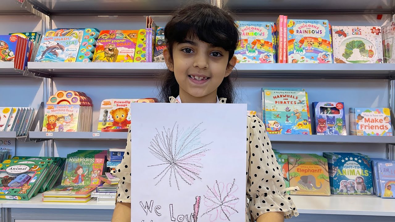 وأعربت الطفلة عن حبها لدولتها دولة الإمارات، من خلال تقديمها غلاف مقترح يحتوي رسمة علم الإمارات وبرج خليفة، ورسمة أخرى عن منصتها.