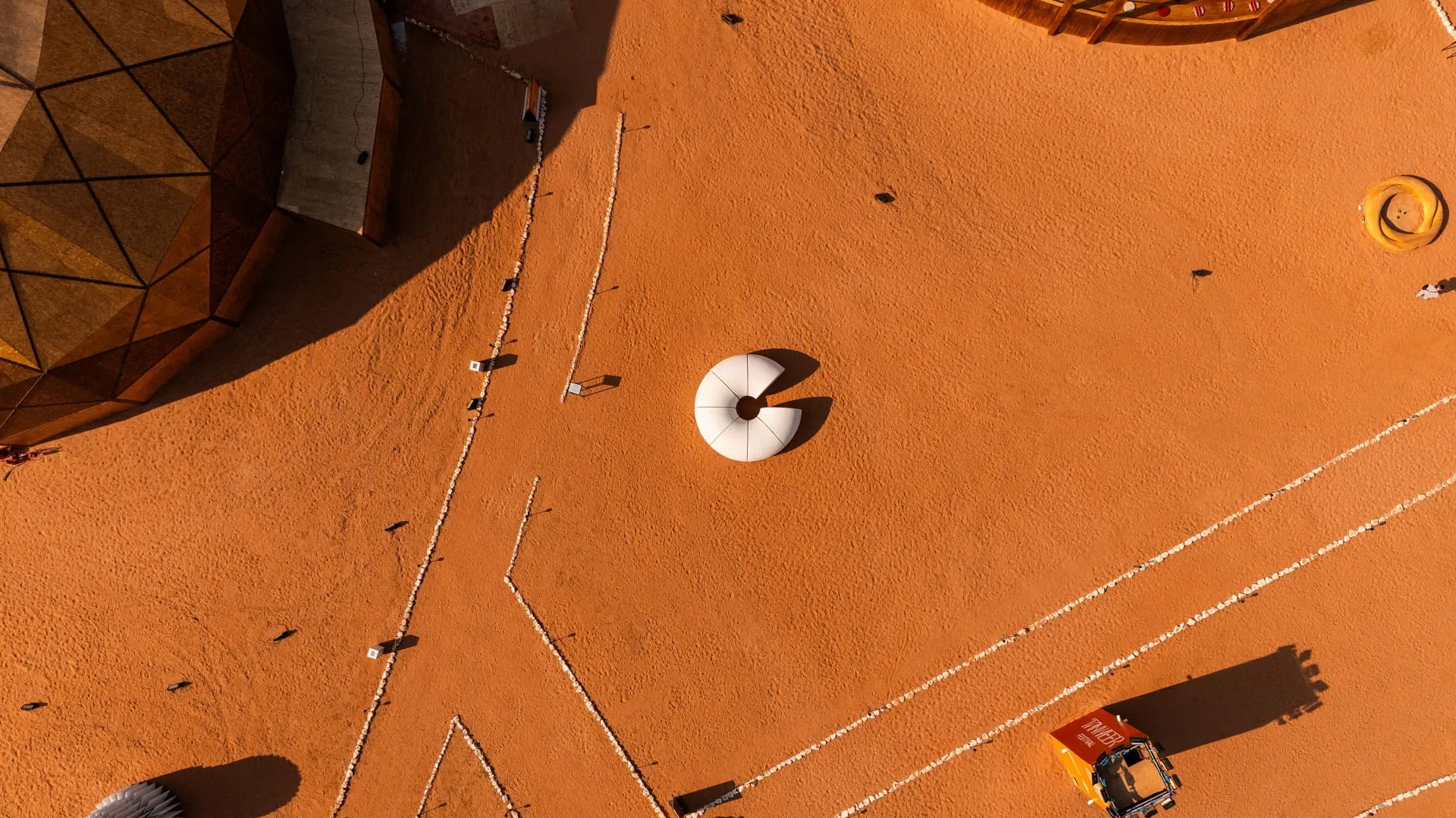Not far from the Moon Retreat, the entrance of Al Badayer Retreat features the work "Star Circle" by UAE-based British artist Patricia Millns. Inspired by the 12th-century poet Rumi, this piece reflects on themes of light and illumination. Created as a white metal structure in the shape of a star overlaid with a circle, it subtly emits light through circular surface perforations, offering a contemplative experience to arriving visitors.
